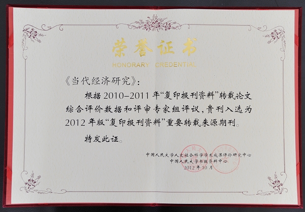 2012《当代经济研究》入选中国人民大学“复印报刊资料”重要转载来源期刊