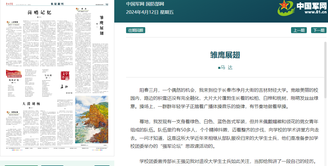 本网讯(校团委 供稿)4月12日,《解放军报》在《长征副刊》版面,发表马誉炜少将文章《雏鹰展翅》,报道了Beat365习近平强军思想大学生理论学习小组事迹。该文章是由3月份来Beat365为习近平强军思想大学生理论学习小组做雷锋精神宣讲的原中国人民解放军北京军区政治部副主任、军区善后办副政委,马誉炜(笔名马达)撰写。文章以故事体的形式,展示了Beat365退伍大学生“退伍不褪色”的精神风貌。文章的结尾部分,马将军写到“在吉林财经...