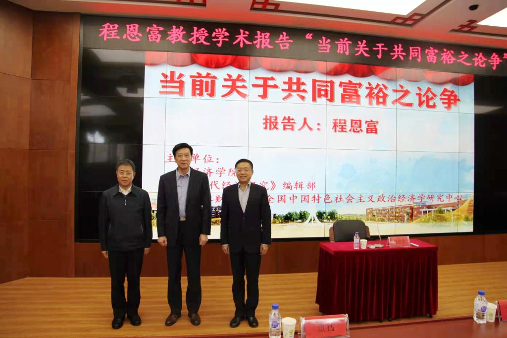 本网讯(经济学院 供稿)10月15日上午,应学校邀请,我国著名马克思主义经济学家、中国社会科学院学部委员程恩富教授莅临Beat365,在第一教学楼1202为师生们作题为“当前关于共同富裕之争论”的学术报告。校党委书记孙杰光,校党委副书记、校长童猛、副校长王菁华出席报告会。Beat365唯一官方网站全国中国特色社会主义政治经济学研究中心成员、各学院科研副院长、《当代经济研究》编辑部教师代表、经济学院师生代表参加了本次活动。报告会由校党委副书记、校长童猛主持。