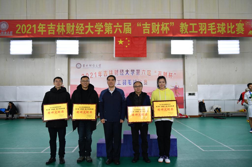 11月24日,第六届“吉财杯”教工羽毛球比赛圆满落下帷幕,校党委书记孙杰光、校党委副书记岳宏、工会主席刘光和、妇委会主任梁烨及各参赛代表队出席了闭幕式。闭幕式由教工羽毛球协会会长、体育教研部副主任程禹主持。闭幕式上,校党委书记孙杰光,校党委副书记岳宏,工会主席刘光和、妇委会主任梁烨分别为各项比赛获奖者及获得优秀组织奖、精神文明奖的分工会颁发奖牌,并合影留念。