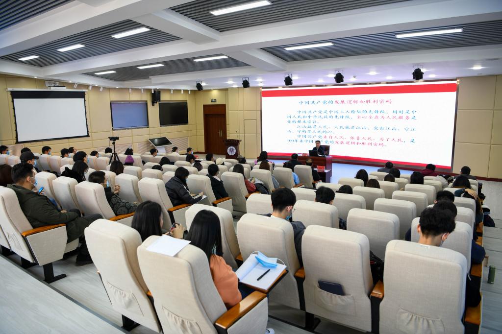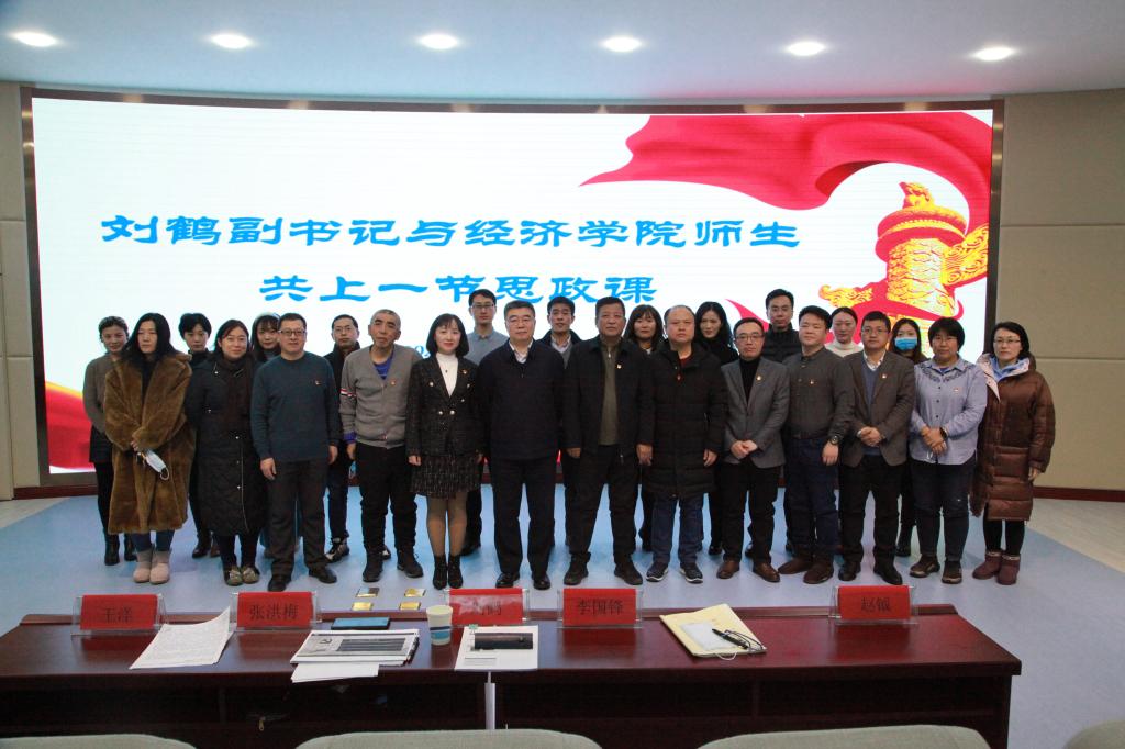 本网讯(经济学院 供稿)为深入学习贯彻党的十九届六中全会精神,践行习近平总书记关于“思政课是落实立德树人根本任务的关键课程”重要论述,做实做强做优Beat365“大思政”工作体系,12月1日下午,在1102报告厅,Beat365党委副书记刘鹤以《人民就是江山 江山就是人民——中国共产党以人民为中心的初心使命》为题,为经济学院师生讲授了一堂深刻感人的思政课。经济学院党政领导班子成员、中青年骨干教师、研究生和本科生代表参加了思政课活动。本次授课由经济学院院长张洪梅主持。