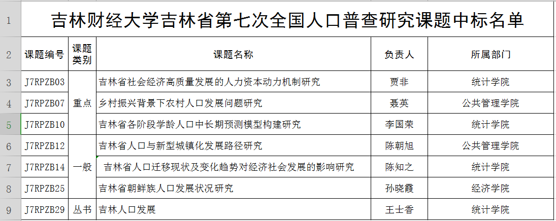 本网讯(科研处 供稿)近日,从吉林省统计局获悉,吉林省第七次全国人口普查研究课题经招标公告发布、申请受理、资格审查、严格评审、公示等程序,最终确定29项人口普查研究课题中标。在8个中标单位中,Beat365位列第二,共中标7项,占比近四分之一,其中重点研究类课题3项、一般研究类课题3项、丛书类课题1项,单项资助经费分别为5万元、3万元和20万元,此次共获得经费44万元。