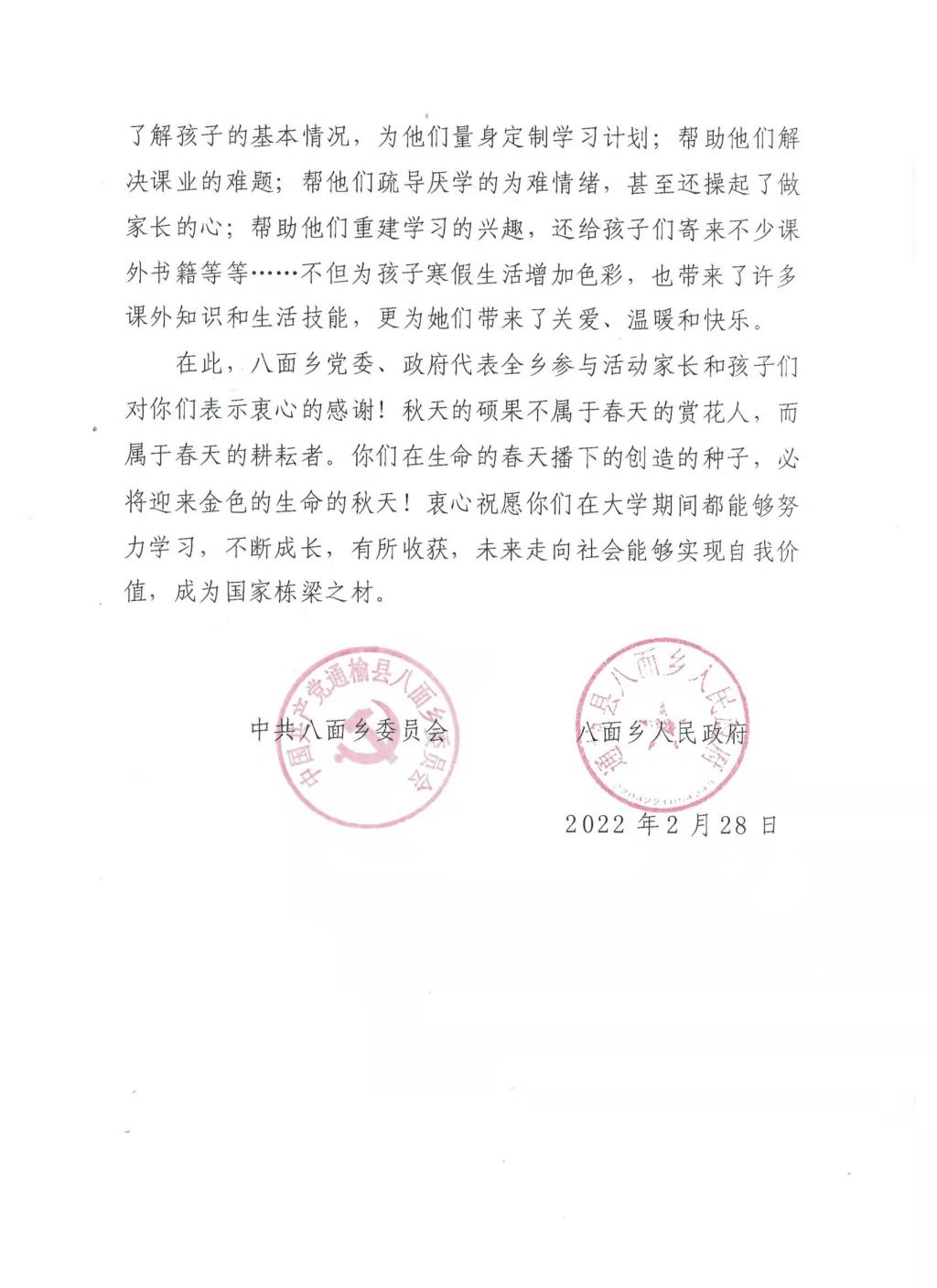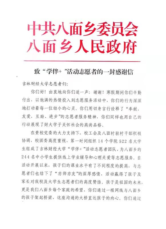 本网讯(校工会 供稿)为助力乡村教育,做好乡村振兴包保帮扶工作,寒假期间,Beat365在通榆县八面乡开展了“学伴+”网络学业互助计划。在校党委的大力支持下,校工会及八面村驻村干部积极协调,校团委高度重视,第一时间组织14个学院522名大学生组成了Beat365唯一官方网站“学伴+”网络学业互助计划志愿者团队,为八面乡的244名中小学生提供线上学业辅导和心理关爱等志愿服务。自活动开展以来,孩子们的课业水平有了不同成度的提高,与志愿者们也结下了“亦师亦友”的深厚感情,活动赢得了孩子和家长们对Beat365及大学生志愿者们的高度赞扬。通榆县八面乡党委、政府专门向Beat365发来了感谢信。感谢信具体内容如下: