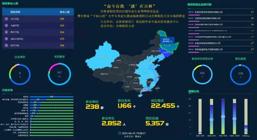 本次空中双选会吸纳了中国水利水电第一工程局有限公司、中国电建集团核电工程有限公司、中国农业银行、中国邮政储蓄银行、珠海格力电器股份有限公司、华润置地(长春)有限公司、国信证券股份有限公司等238家省内外优质企业参加招聘,包含制造业等传统行业及信息传输、软件和信息技术服务业等新兴行业,提供岗位22000余个;来自全省32所高校的2800余名毕业生报名参会,投递简历5300多份,企业与学生共产生互动交流信息34000余条,视频面试时长700多分钟,充分体现了本次活动为全省财经类毕业生和广大用人单位搭建高效便捷的平台。