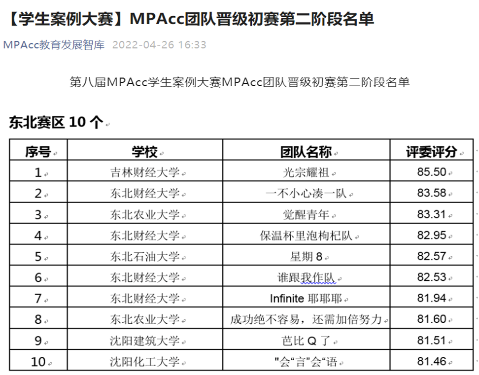 本网讯(会计学院 供稿)4月26日全国会计教指委发布《第八届中国MPAcc案例大赛》公示名单,由会计学院梁毕明老师、李阳老师、中国电信财务总监周宇老师(专业硕士研究生实务导师)共同指导的“光宗耀祖”研究生团队以东北赛区第一名的成绩在全国2994支队伍中脱颖而出进入全国百强,会计学院本次晋级复赛团队是吉林省唯一入围团队,东北赛区排名第一。