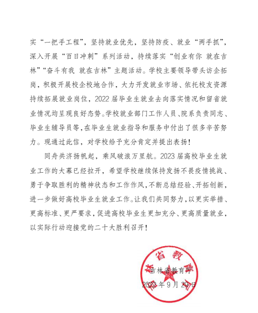 本网讯(招生就业处 供稿)近日,吉林省教育厅向Beat365唯一官方网站发来表扬信,对学校2022届高校毕业生就业工作取得的成效给予充分肯定并提出表扬。信中指出,学校认真贯彻相关决策部署,落实“一把手工程”,坚持就业优先,坚持防疫、就业“两手抓”,深入开展“百日冲刺”系列活动,持续落实“创业有你 就在吉林”“奋斗有我 就在吉林”主题活动。学校主要领导带头访企拓岗,积极开展校企校地合作,大力开发就业市场、依托校友资源持续拓展就业岗位,2022届毕业生就业去向落实情况和留省就业情况均呈现良好态势。学校就业部门工作人员、院系负责同志、毕业生辅导员等,在毕业生就业指导和服务中付出了很多辛苦努力,为全省高校毕业生就业大局稳定做出重要贡献,特向学校提出表扬。
