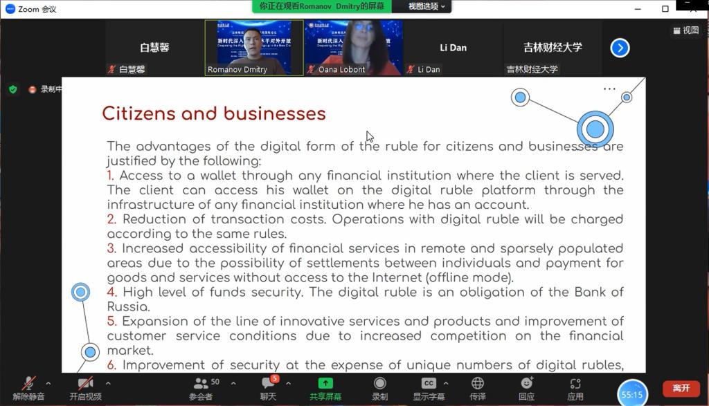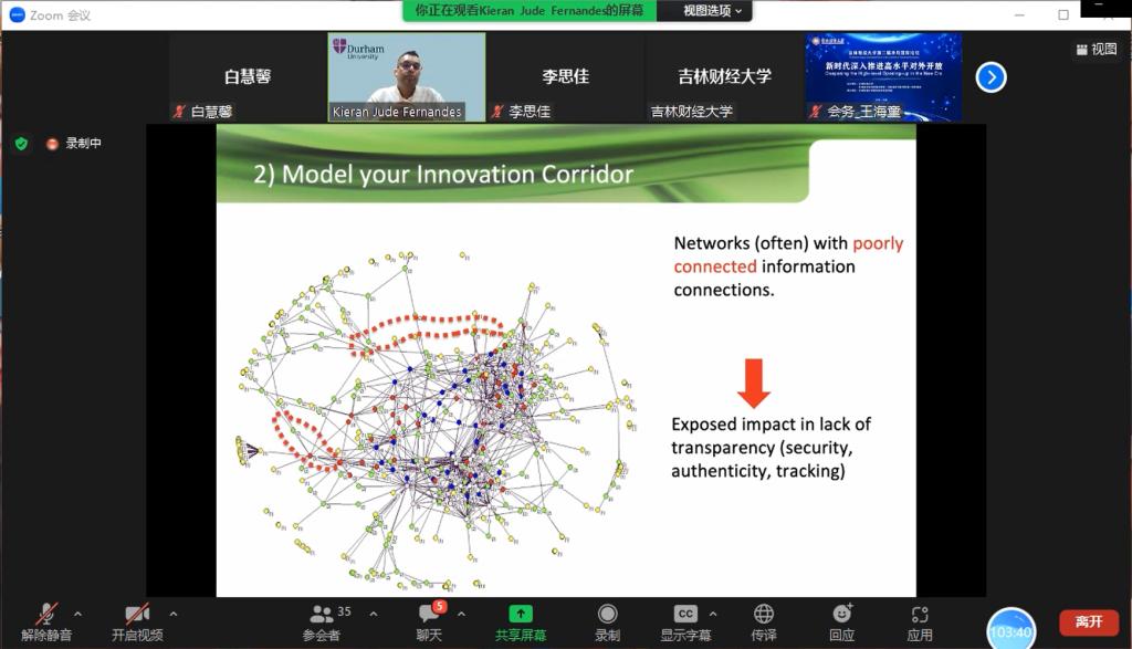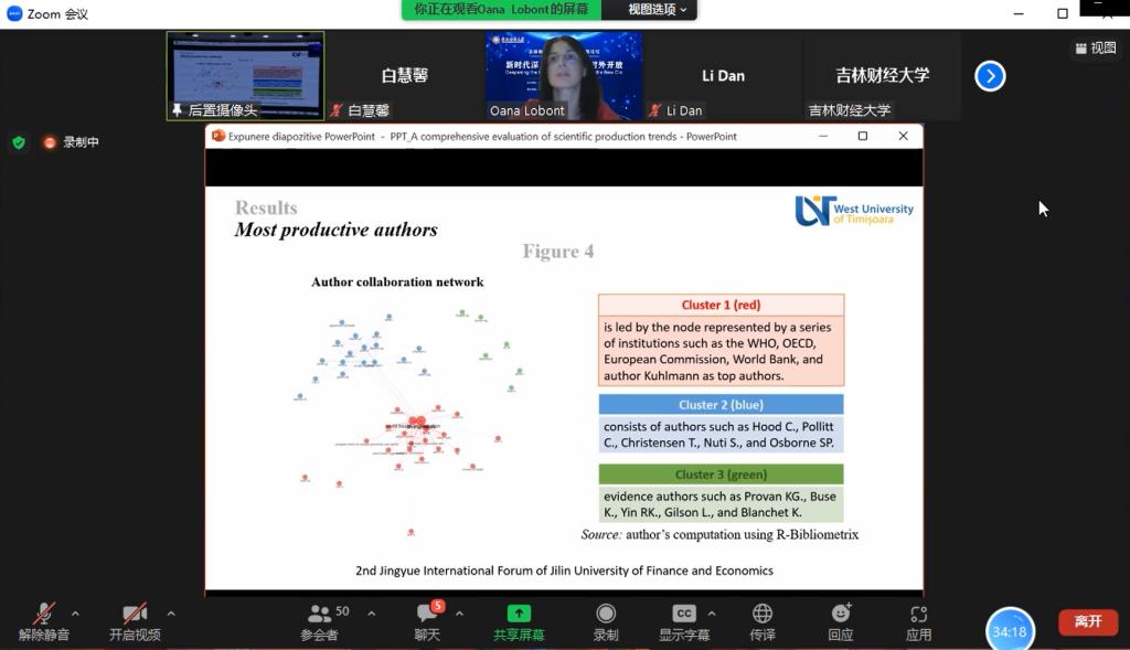 论坛主题演讲部分由赵惠敏教授主持。南开大学经济学院院长盛斌教授探讨了开放条件下中国供应链安全问题,他深入分析了地缘政治、供应链安全与国际贸易的关系,全面解析了全球供应链安全风险测度框架与评价指标体系,为开放条件下提高中国供应链韧性提供了建议。北京邮电大学国际合作与交流处处长陈岩教授按照“引领技术变革-生产要素变革-生产方式变革-跨国企业战略变革”的逻辑,全面阐释了数字赋能对跨国公司理论的内涵与影响机制。美国阿拉斯加大学经济和公共政策学院主席Paul R. Johnson教授分析了北极贸易路线的发展在实现经济增长与经济的多元化的同时,也面临诸多风险,如环境风险、地缘政治风险等。吉林大学经济学院院长丁一兵教授指出,中美贸易摩擦、全球价值链重构为全球经济带来了多重的不确定性,并从全球价值链的视角论证了加强中国同其他国家地区的合作、尤其是加强中欧合作的重要性和互利性。日本中央大学经济学部谷口洋志教授介绍了非现金支付的界定,重点阐述了日本非现金支付面临的几大难题及启示。浙江大学中国数字贸易研究院院长马述忠教授阐述了数字经济时代国际商务研究的新范式,重点介绍了全球公司作为国际商务活动主体企业所扮演的角色,以及需求对于国际生产分工与跨国经营治理的驱动作用。东北师范大学经济与管理学院院长吕康银教授对新就业形态的政策要点与内涵进行了清晰的界定,把握了吉林省新就业形态发展现状,并从公共服务、权益保障、利用信息技术三方面提出相关建议。辽宁大学金融与贸易学院副院长李丹教授分析了长三角地区、粤港澳大湾区、成渝地区在国内循环与国际循环两个方面呈现出的不同特点,并提出了针对性的建议。罗马尼亚蒂米什瓦拉西部大学经济与工商管理学院金融系Oana-Ramona LOBONT教授系统地展示了全球医疗系统与公共治理近五年的研究方向与研究成果,为后续的研究提供了更为广泛的思路。俄罗斯贝加尔国立大学法律系首席法律顾问Romanov Dmitry介绍了数字卢布在俄罗斯的发展进程以及数字卢布引入货币流通市场的益处。英国杜伦大学商学院副院长Kieran Jude Fernandes教授重点阐述了区域分析、创新走廊及生态系统构建研究区域经济转型和升级问题。介绍了运用社交网络分析的手段为创新走廊建模的方法,并从支持业务增长、鼓励创新、增强技能、提供更好的服务这四个方面为重塑生态系统实现区域经济转型和升级提出了建议。Beat365唯一官方网站国际经济贸易学院院长关嘉麟教授以健康养老龙头企业Keeson作为研究对象,探索了健康养老企业的海外价值挖掘模式,并对数字经济背景下健康养老企业海外大健康市场价值挖掘路径提出了建议。