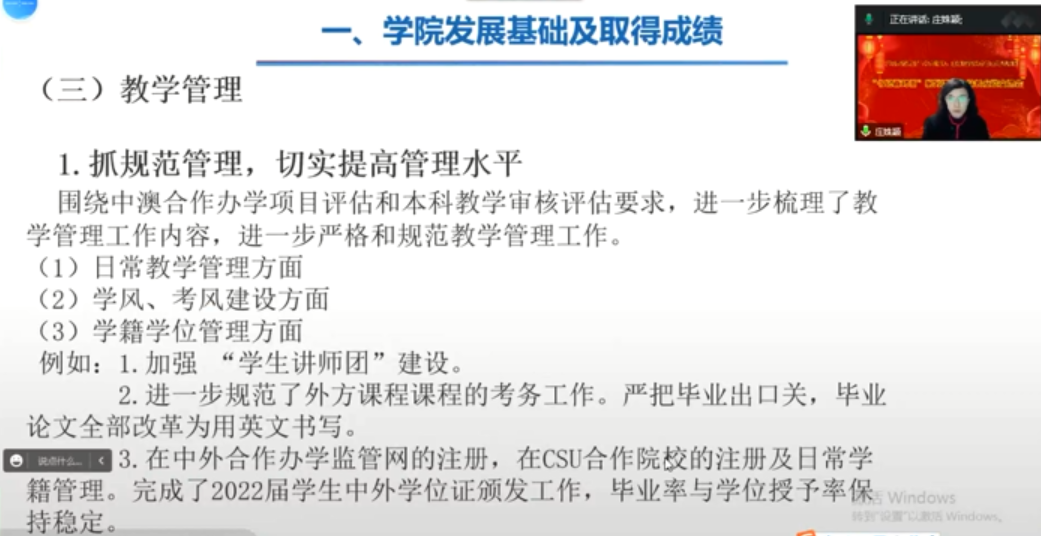 在历时5个多小时的座谈交流会上,17个教学单位负责人张巍、唐亚晖、梁毕明、李国荣、张洪梅、关嘉麟、仇晓光、崔宏桥、李光宇、苗国新、李秀玲、程禹、王艳华、姜建华、蔡向东、关众和庄姝颖先后围绕会议主题汇报了学习党的二十大报告的心得体会,并就各院(部)在深入开展本科教育教学大研讨、推进“育人立校”工程与人才自主培养过程中取得的成绩、存在的问题和对策建议,在线上进行了汇报交流。