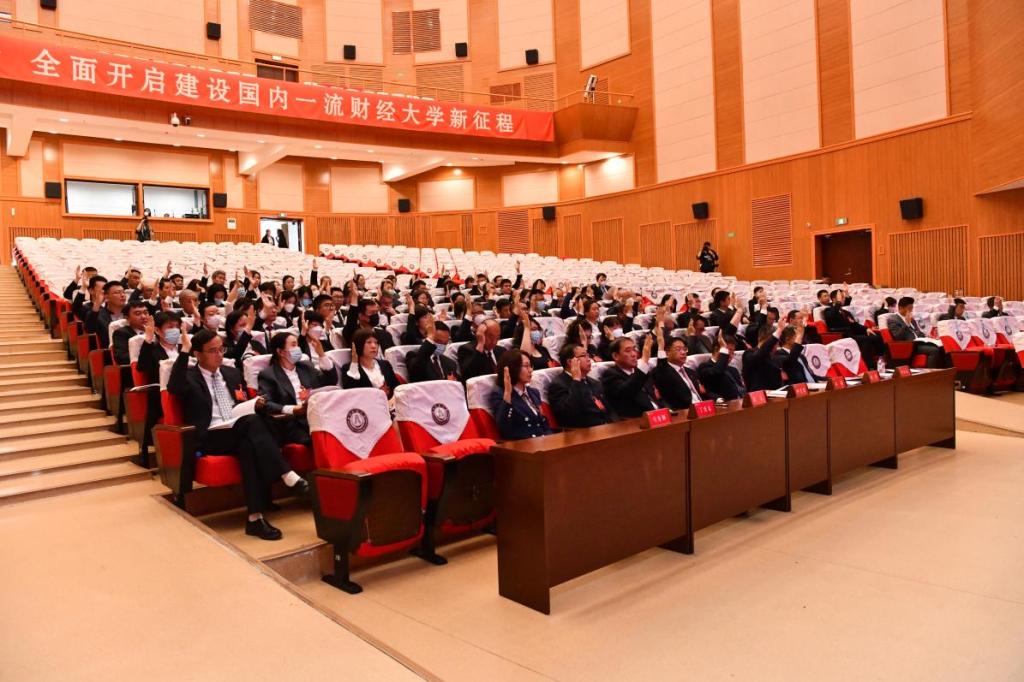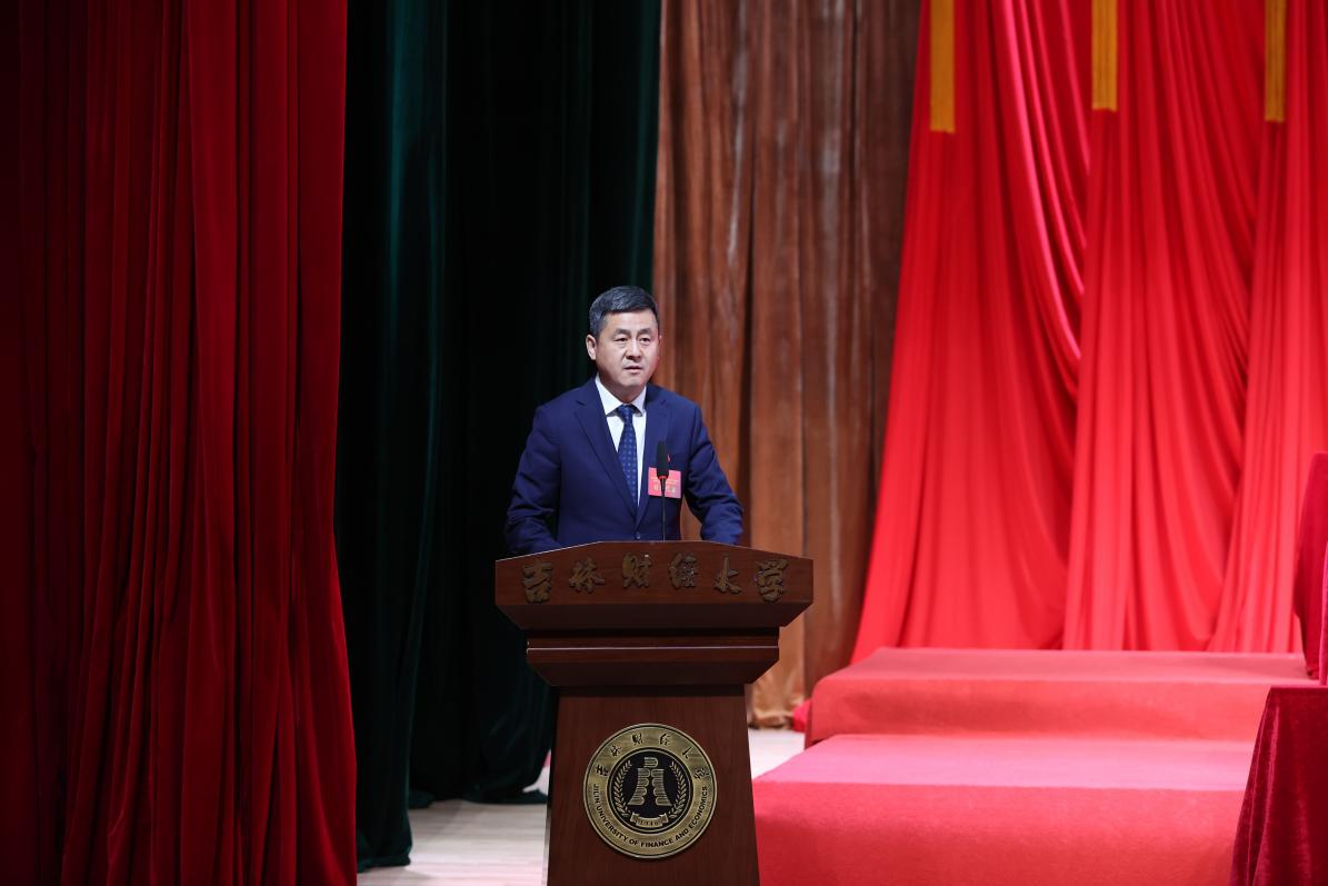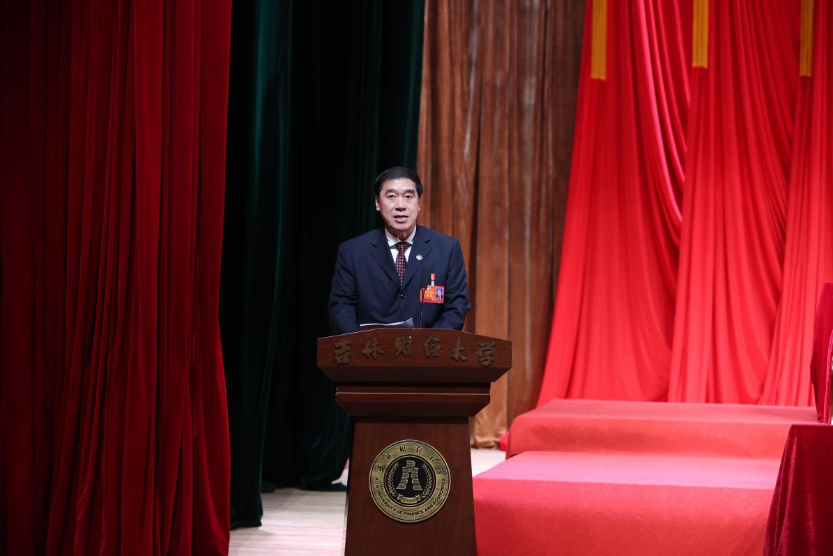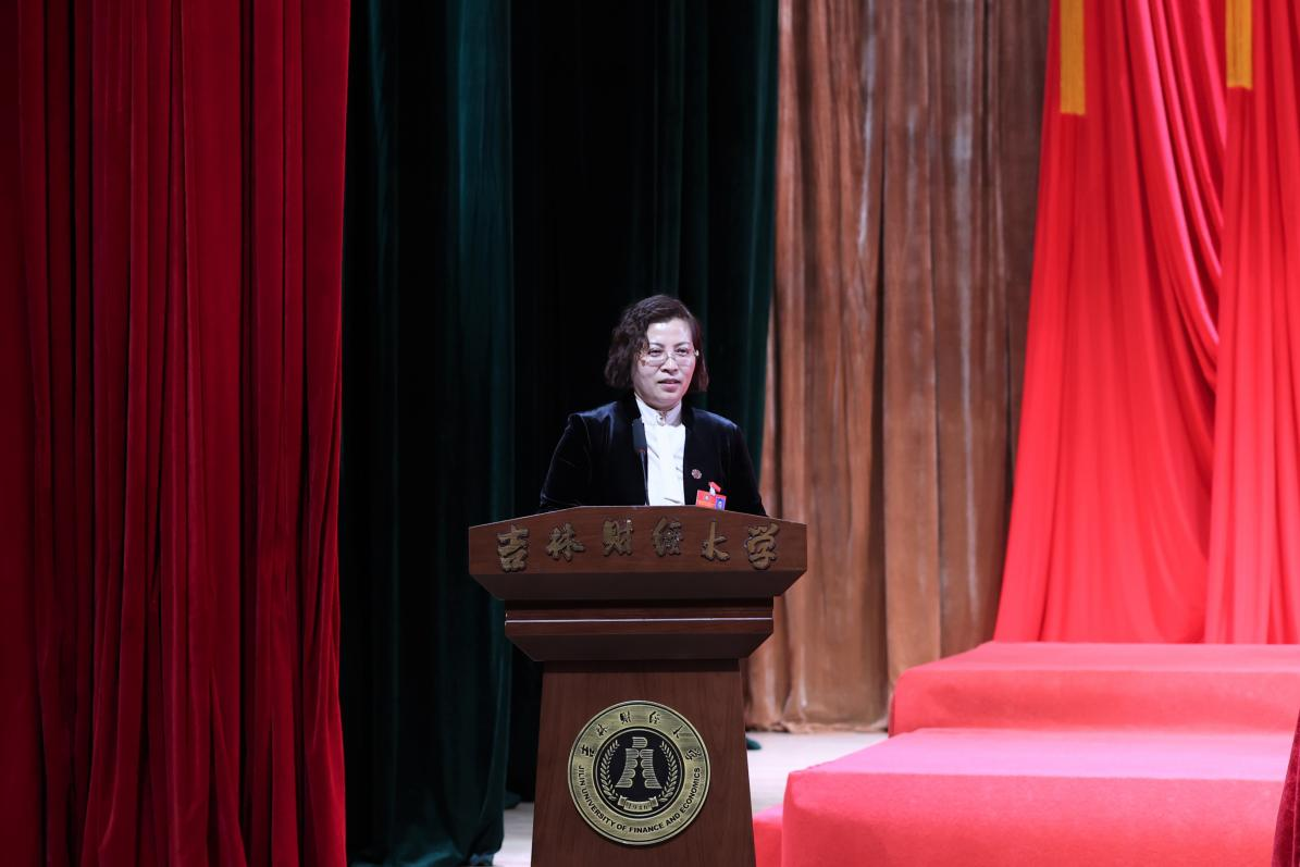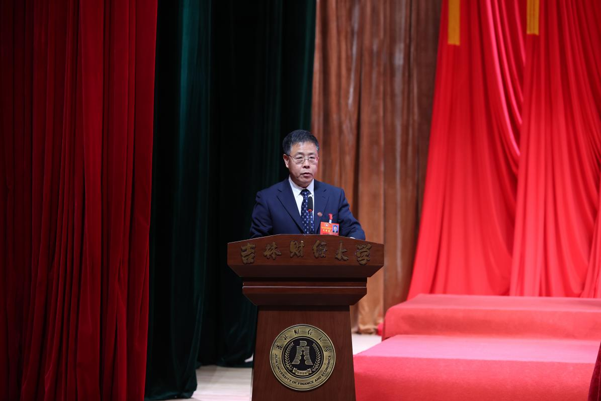 会上,校党委副书记、校长童猛作了题为《保持战略定力,全面深化改革,奋力开创国内一流财经大学建设新局面》的工作报告。童猛从十个方面回顾了学校自上次“双代会”以来取得的成绩:一是深化教育教学改革,深入实施“育人立校”战略工程,招生就业形势持续向好,人才培养质量显著提升。二是加强学科内涵建设,重点打造优势学科集群,学科综合实力和竞争力进一步增强。三是坚持实施“人才强校”战略,多措并举努力提高师资队伍实力和水平,教师队伍结构进一步优化。四是创新科研体制机制,修订和完善科研项目管理及培育机制,原始创新能力显著增强。五是聚焦国家战略与东北振兴发展需求,充分发挥学校办学育人、资政启民的功能作用,社会服务质量进一步增强。六是坚持国际化办学理念,加强国际合作交流,开放办学水平不断提高。七是坚持弘扬社会主义核心价值观,传承红色基因,积极培育打造高校文化育人创新载体和独具特色的校园文化,校园文化生态持续向好。八是加强党对学校工作全面领导的体制机制建设,坚持依法治校,学校治理效能不断提升。九是坚持改革成果普惠共享,加大民生保障投入,师生幸福指数不断提升。十是聚力党建引领,为学校事业高质量发展提供坚强的政治保障。童猛强调,在今后五年的发展中,学校将坚持以习近平新时代中国特色社会主义思想为指导,深入贯彻习近平总书记关于教育的重要论述,以高度的政治自觉思想自觉行动自觉,锚定应用研究型大学办学定位,深入实施“十四五”规划确定的“147”战略任务,着重做好以下七个方面的工作:一是深入实施“育人立校”战略工程,深化拓展本科教育教学大研讨成果,实施本科教育教学改革,推动研究生教育高质量发展,加强思想政治教育,提升服务和管理育人水平,扎实做好招生就业工作,着力提升人才培养质量。二是深入实施“学科兴校”战略工程,着力优化学科布局,着力培育高层次成果,加强科研平台和科研团队建设,打造特色智库,完善学术评价体系,全面提升服务国家重大战略需求和吉林振兴发展的能力水平。三是以“干部人才队伍建设年”为契机,深入实施“人才强校”战略工程,进一步深化人事制度改革,加强师德师风建设,扩充教师队伍规模,提高教师队伍层次,完善人才育选管用机制,大力提升人才队伍实力水平。四是加强国际合作交流,促进师资队伍国际化,努力构建国际化人才培养体系;推进中外合作办学质量,加强留学生教育,不断拓宽学校对外合作的空间和领域;加强国内合作,发挥校友会重要作用,加强教育基金会规范化建设。五是加强服务保障能力建设,实施“办学资源筹集”和“校园基本建设”计划,提高教职工待遇,提升师生的幸福感和满意度。六是全面深化综合改革,完善大学制度体系,实施内部管理体制改革,深化人事分配制度改革,落实教育评价任务,不断提升治理体系和治理能力现代化水平。七是坚持以党的政治建设为统领,深入实施“党建引领”战略工程,加强思想政治建设、干部队伍建设和基层组织建设,落实全面从严治党,国内一流财经大学建设提供坚强政治保障。