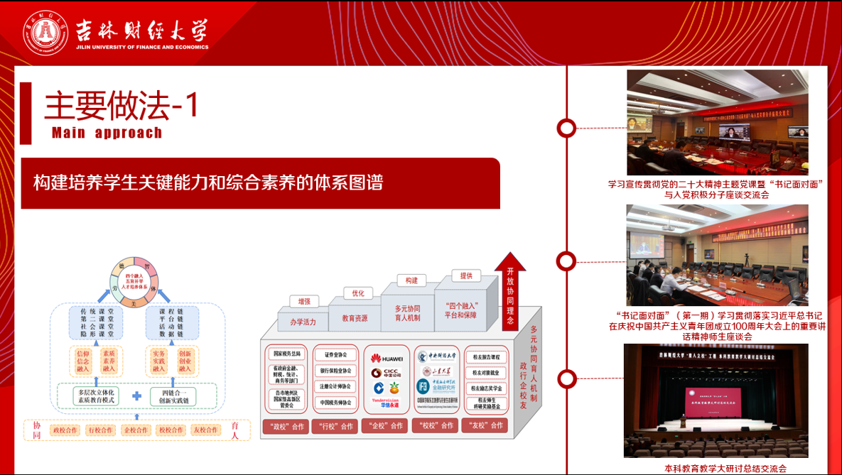 近年来,学校党委以高质量党建引领学校事业高质量发展,深入实施“党建引领”基层党组织建设质量提升工程,大力开展党建品牌创建培育工作。特别是全省高校“党建优秀品牌、党建特色品牌”评选活动开展以来,学校党委高度重视,始终把培育建设党建工作品牌、凝练总结特色立德树人做法作为一项重要工作抓实落细,以习近平总书记提出的“六个下功夫”为导向,坚持“为党、为国,为区域经济发展培育财经英才”的初心使命,在长期的办学治校实践中不断总结凝练,最终凝练出“四个融入、五育并举”的人才培养体系,形成了“1+4+N”的制度体系,构建培养学生关键能力和综合素养的体系图谱。该品牌项目获评2022年省级优秀教学成果一等奖,被推荐参评国家级教学成果奖,被“学习强国”、人民网等主流媒体专题报道,并在东北财经大学、广东财经大学等兄弟院校推广应用。