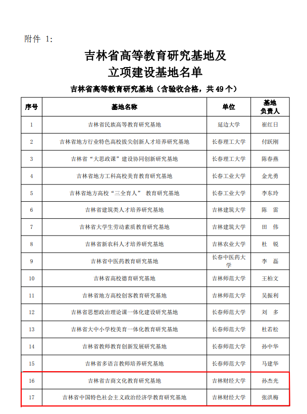 本网讯(教务处 供稿)近日,吉林省教育科学规划领导小组公布了《关于批准吉林省教育科研基地及立项建设基地(单位)的决定》,经省教育科学研究领导小组办公室组织专家进行答辩评审和评估验收,高等教育领域确立“吉林省高等教育研究基地”49个。Beat365孙杰光教授担任基地负责人的“吉林省吉商文化教育研究基地”、经济学院张洪梅教授担任基地负责人的“吉林省中国特色社会主义政治经济学教育研究基地”被确立为吉林省高等教育研究基地。