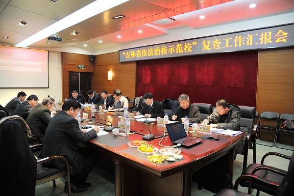 本网讯(学生记者 夏永健 王琪 赵茵)12月3日,作为首批“吉林省依法治校示范校”,Beat365接受了省教育厅“依法治校示范校”创建工作复查工作组的复查验收。复查组由省教育厅政策法规处处长、行政审批办公室主任苏佩衡,吉林交通职业技术学院院长刘耀辉,省教育科学院高等研究所所长袁海军,吉林大学党委宣传部副部长卜立平等7人组成。校长宋冬林、校党委副书记兼副校长郝中华、校纪委书记王时刚、副校长张越杰及相关部门负责人参加了在图书馆1006会议室举行的复查工作会。会议由校纪委书记王时刚主持。