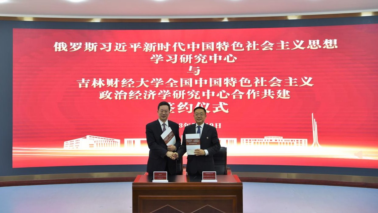 在双方与会领导和师生的见证下,孙杰光与周立群共同签署《“俄罗斯习近平新时代中国特色社会主义思想学习研究中心”与“全国中国特色社会主义政治经济学研究中心”合作共建协议》。