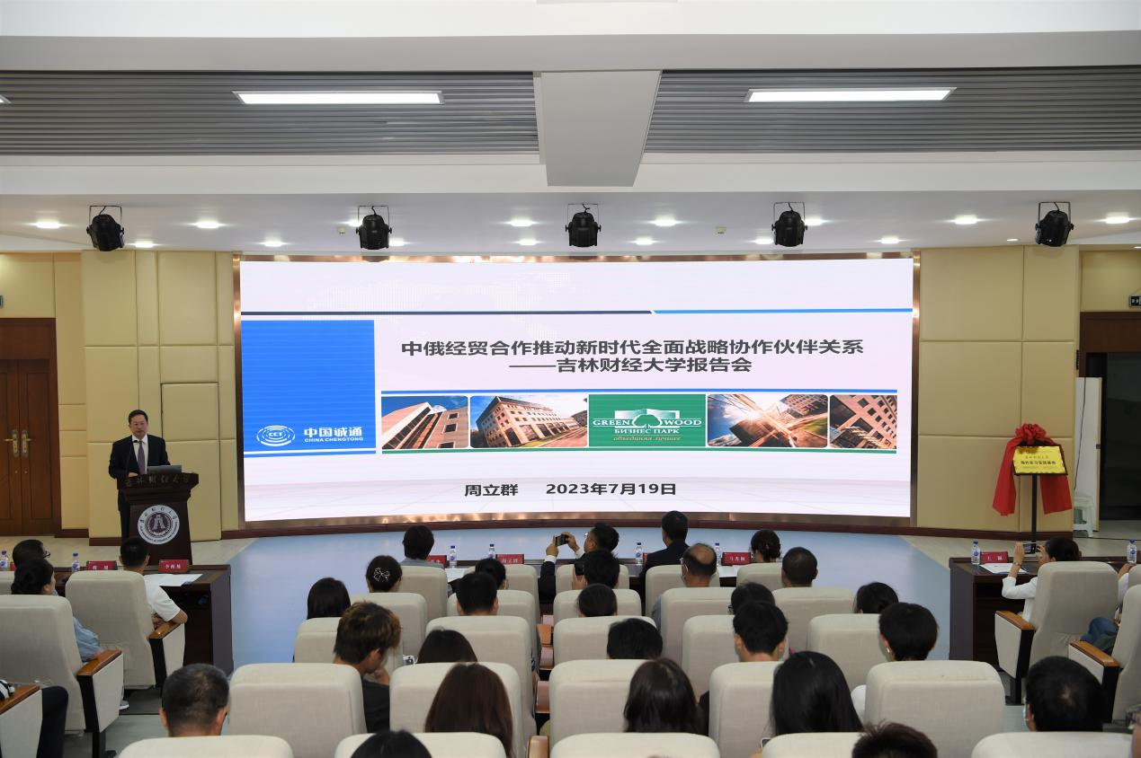 仪式后,周立群为与会师生作了《中俄经贸合作推动新时代全面战略协作伙伴关系》主题报告。周立群介绍了中俄经贸合作的发展历程、中俄经贸合作的现状与前景展望、深化新时代中俄全面战略协作伙伴关系,新时代俄罗斯中国总商会及诚通国际等中国企业对俄合作的基本情况、以及吉林对俄经贸合作面临前所未有的发展机遇等,最后提出了携手构建Beat365唯一官方网站海外实习基地,服务国家“一带一路”人才培养,为新时代吉林全面、全方位振兴增添新的动能,助力吉林振兴,共筑民族复兴中国梦的希望。