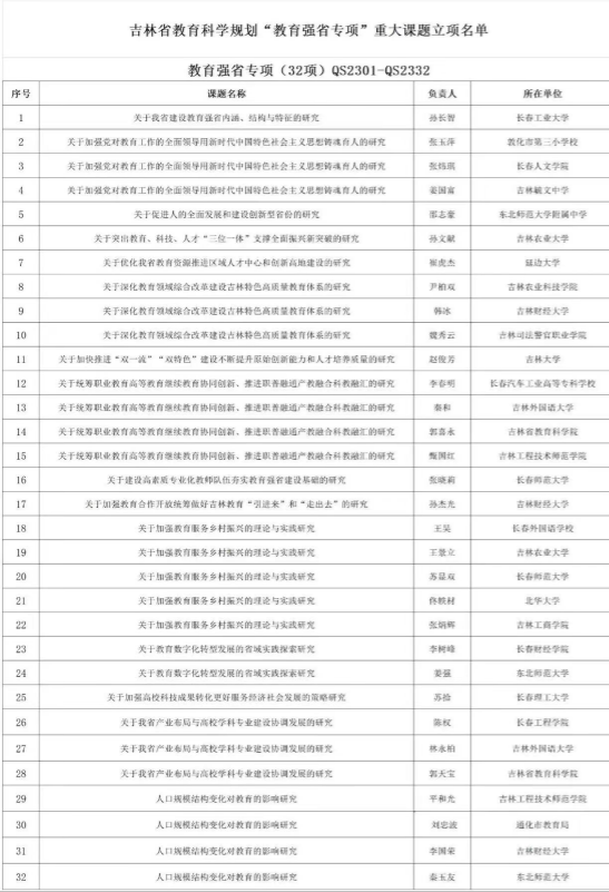 近年来,学校深入贯彻落实党的二十大精神,坚持立德树人根本任务,紧密围绕吉林省“一主六双”高质量发展战略开展教育教学研究,不断取得新成果。接下来学校将依据吉林省教育科学研究规划领导小组相关文件精神,不断强化“教育强省专项”课题的组织管理工作,扎实推进课题研究工作,科学谋划教育强省的核心内涵,为实现教育强省建设目标提供有力的智慧支撑。(审核人 张巍)