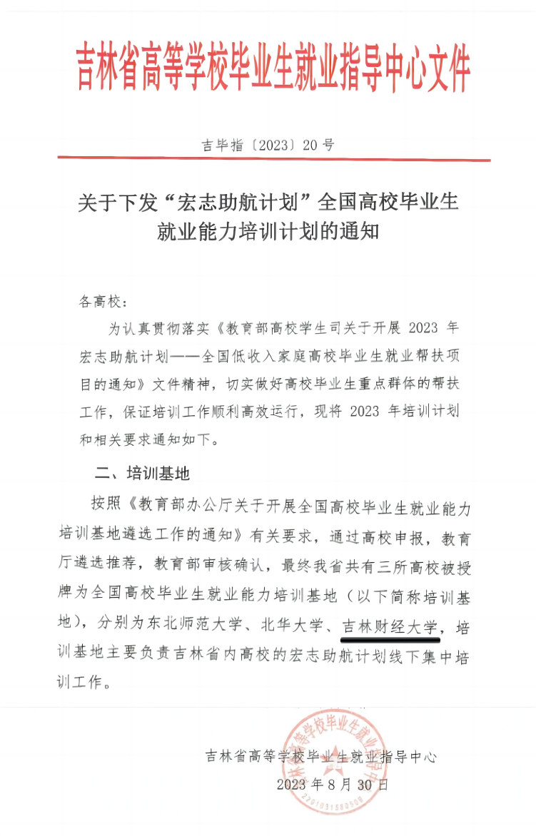 本网讯(招生就业处 供稿)近日,根据教育部关于宏志助航计划的统一安排,全国高校毕业生就业能力培训基地遴选结果揭晓。经过学校申报、省教育厅初审、教育部审核,Beat365被授予“全国高校毕业生就业能力培训基地”,目前吉林省仅有东北师范大学、北华大学、Beat365唯一官方网站3所高校入选。