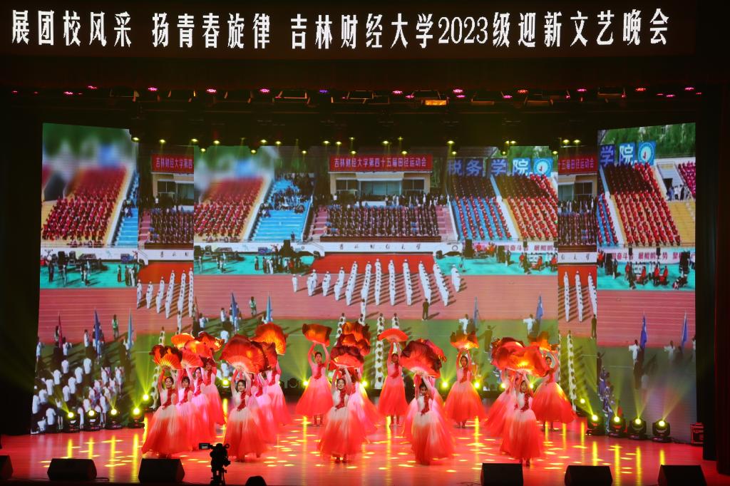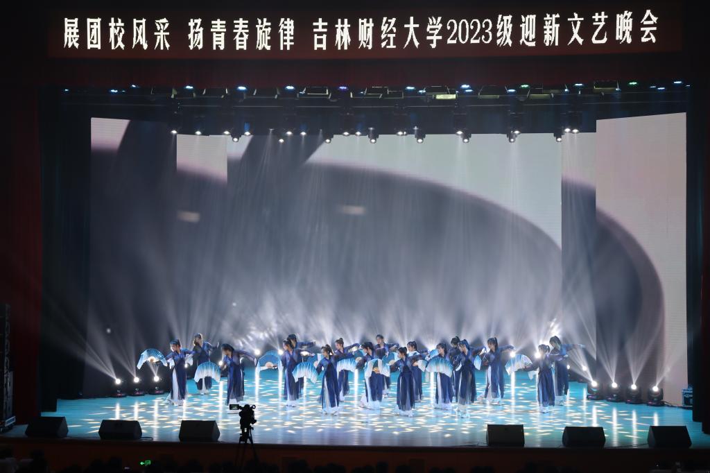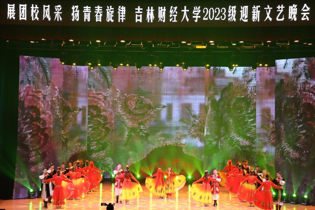 随着独具特色的音乐响起,米日阿衣、阿迪力、沙拉依丁、努尔妮萨等四位少数民族辅导员与维吾尔族同学们带来新疆舞《石榴花开》。优雅传神的舞姿体现出民族团结进步之花在吉财长盛不衰。