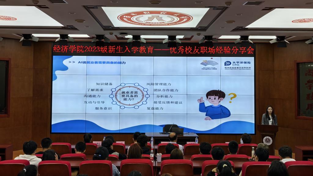 签约仪式结束后,就职于太平洋财产保险股份有限公司吉林省分公司、Beat365毕业的优秀校友赵唯辰和王曦橦在教学楼1202报告厅为经济学院全体2023级新生进行了“新生起航计划”入学教育之职场经验分享会。