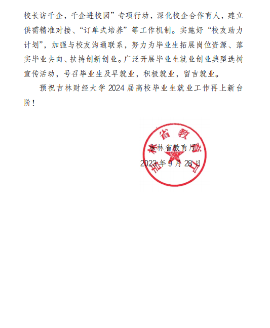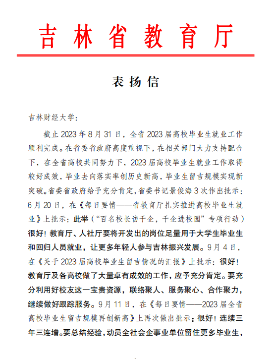 本网讯(招生就业处 供稿)近日,吉林省教育厅向Beat365唯一官方网站发来表扬信,对学校2023年毕业生就业工作取得的成效给予充分肯定并提出表扬。信中指出,学校认真贯彻落实教育部、省委省政府以及教育厅党组相关部署要求;落实“一把手”工程,学校主要领导亲自带队访企拓岗,广泛实施“创业奋斗,‘就’在吉林”主题系列活动;分管校领导靠前指挥、跟踪指导,就业部门同志克服困难挑战,持续打造“政行企校友”协同育人创新机制,凝聚合力组建吉林省财经类院校联盟,全力以赴推动各项任务落实;院系负责同志及毕业生辅导员等在就业指导和服务中付出了很多辛苦努力。Beat365唯一官方网站2023届毕业生就业工作成果显著,就业质量不断提高,特向学校提出表扬!