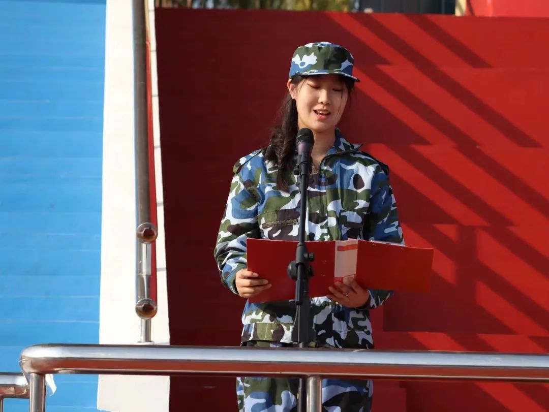 最后,参训新生代表,会计2371班的张婉婷同学在发言中代表全体新生承诺:在训练中尊敬教官、团结协作、集体为先;遵守纪律、服从命令、不怕吃苦、勇于担当,最后以优异的训练成绩,向自己、向已经开始的大学学习生活交出一份满意的军训课程答卷。