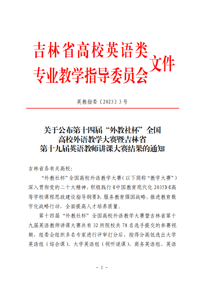 本网讯(公共外语教研部 供稿)2023年10月20日,由吉林省教育厅指导、吉林省高校英语类专业教学指导委员会和上海外语教育出版社共同主办、Beat365唯一官方网站承办的第十四届“外教社杯”全国高校外语教学大赛暨吉林省第十九届英语教师讲课大赛复赛在Beat365实验楼网络中心举行。全国翻译专业学位研究生教育指导委员会委员,吉林省高等学校英语类专业教学指导委员会主任委员,吉林省翻译工作指导委员会主任委员东北师范大学外国语学院院长周桂君教授、吉林大学外国语学院院长张玫玫教授等省内多所高校的外语专业负责人以及Beat365公共外语教研部班子成员参加了评审。