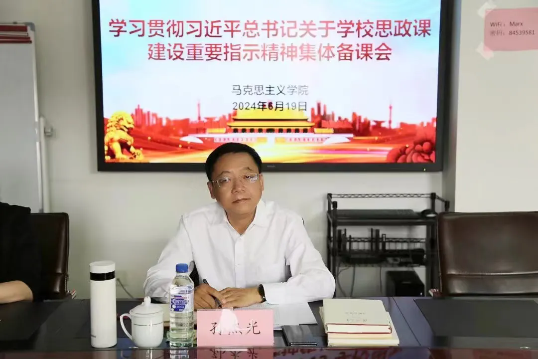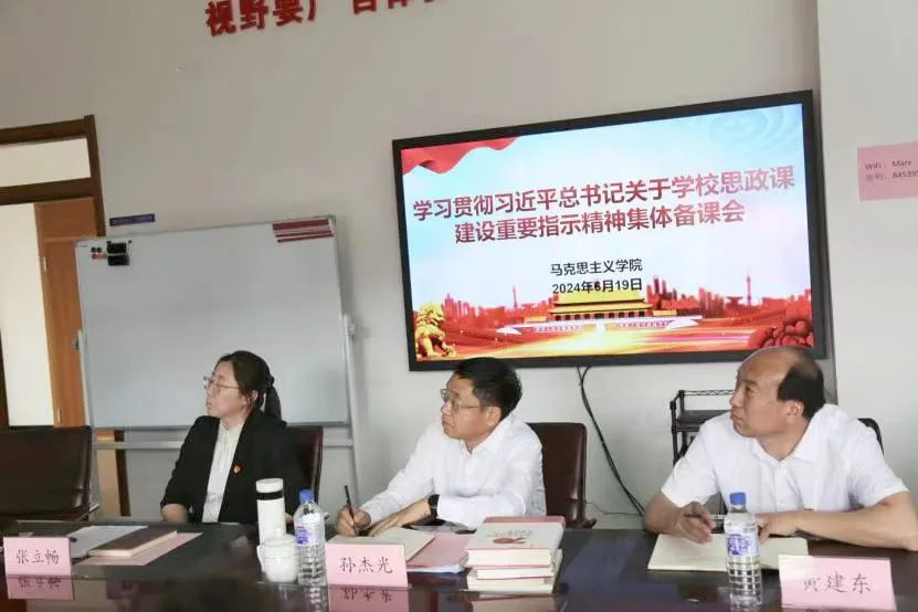 本网讯(马克思主义学院 供稿)6月19日下午,为贯彻落实习近平总书记关于学校思政课建设的重要指示精神,落实好新时代学校思政课建设推进会精神,马克思主义学院召开思政课教师集体备课会。学校党委书记孙杰光参加集体备课会并与教师深入交流,学院全体教师参加了备课会,会议由马克思主义学院党总支副书记、院长张立畅主持。