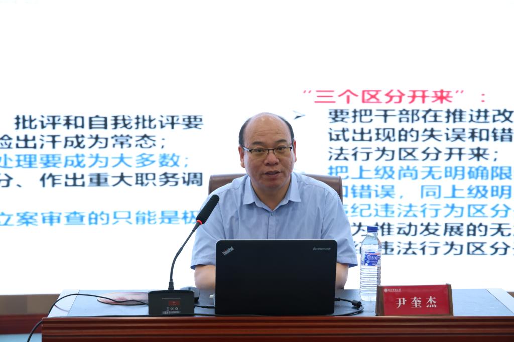 尹奎杰首先介绍了《条例》的修订背景,然后从“解决大党独有难题、健全全面从严治党体系;严抓严管、锻炼党性、正风肃纪;准确运用、严格落实、及时报告;新形势下全面加强党的纪律建设”等四方面系统讲解了《条例》的修订要求,并结合近年来教育系统典型案例,从“需要把握的几个问题,总则部分的亮点,对违反政治纪律、组织纪律、廉洁纪律、群众纪律、工作纪律、生活纪律行为的表现及处分”等几方面,对《条例》进行了详细解读。最后以“两个结合”与“一个注意”深刻阐述了如何贯彻落实好《条例》。