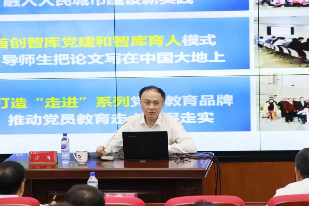 许涛以深入学习贯彻党的二十大报告为切入点,解读新时代党建的总体要求和主要任务。以如何解决“高校基层党建上热中温下冷”“党建与事业发展两张皮”的问题为导向,从融合式特色党建的总体概括、生动实践、突出成效和思路举措四个方面出发,介绍了上海财经大学融合式特色党建的生动实践和具体做法。如搭建“书记谈心”系列活动平台、创新区域化党建联建机制、首创智库党建和智库育人模式、打造“走进”系列党员教育品牌等,这些举措不仅增强党组织的政治功能和组织功能,提升干部队伍的素质,更为师生提供丰富的实践育人平台。通过创办“书记下午茶”“我与书记面对面”“书记讲党课”等活动,成功将思政工作做到师生的心坎上。通过把牢智库政治方向、创新开展智库党建、引领推动智库育人等措施,在育人和咨政方面取得显著成效。经过五年多的探索实践,上海财经大学形成融合式特色党建的工作理念,创建一系列特色党建品牌,为加强党的领导与教育事业发展奠定坚实基础。