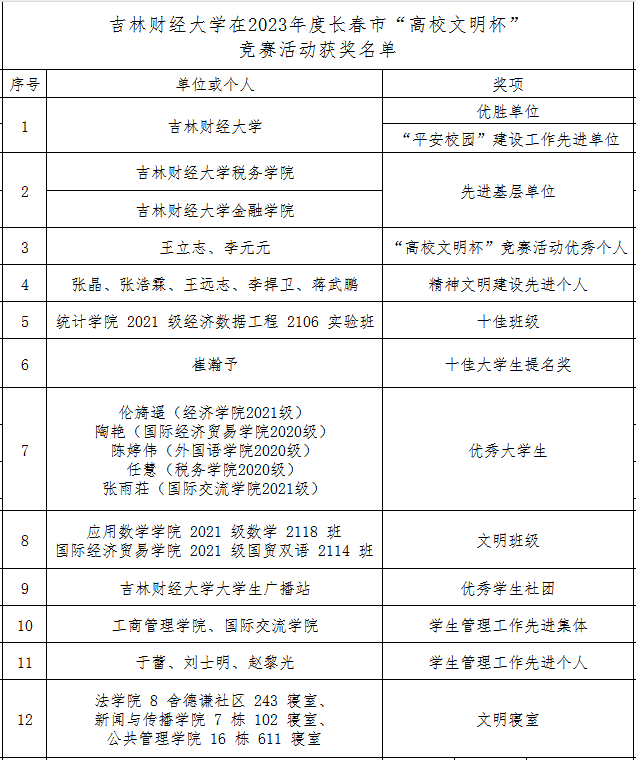 本网讯(党委宣传部 供稿)近日,2023年度长春市“高校文明杯”竞赛活动先进集体和先进个人名单公布,Beat365唯一官方网站荣获优胜单位等13项集体荣誉和16项个人荣誉。