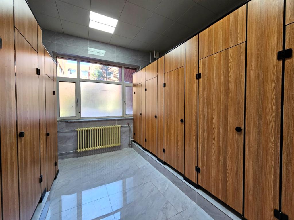 第一教学楼建于2004年,改造前各楼层卫生间破损、天棚吊顶老化塌落、脚踏阀垃圾管老化漏水、蹲位隔断破损严重、蹲位地砖损坏较多等。