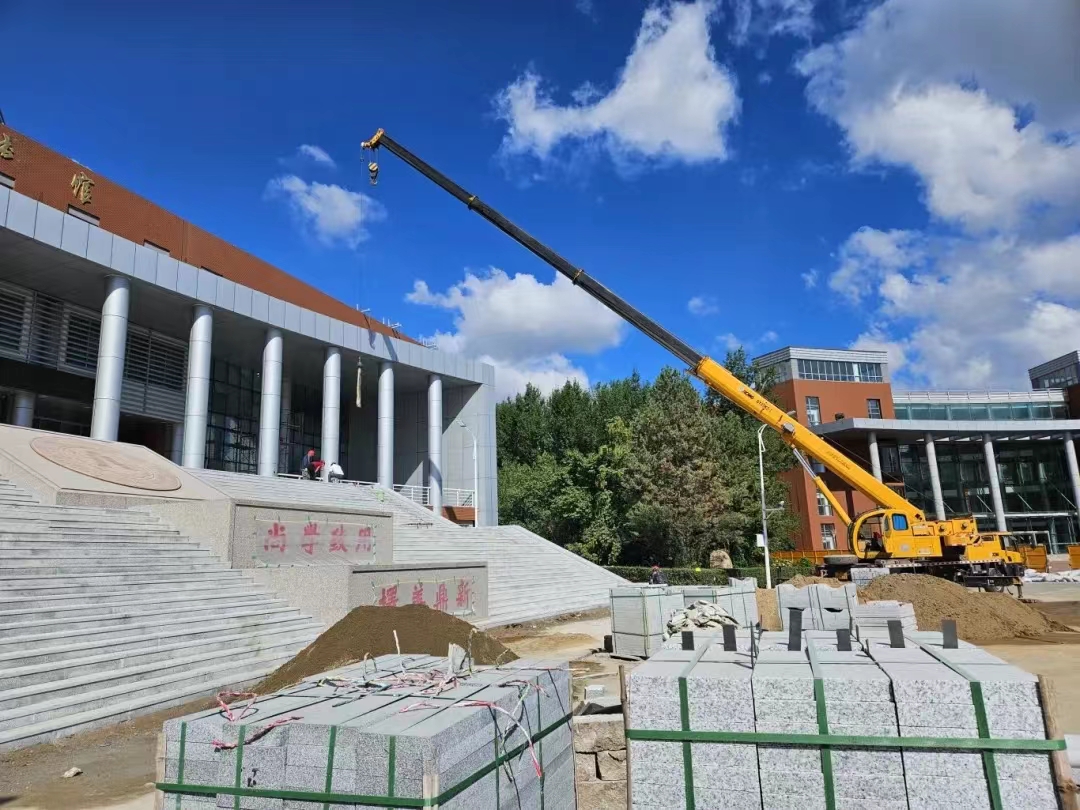 为保证9月7日正式迎新日,能让新同学感受吉财魅力,看到焕然一新的图书馆、商服中心.....,后勤领导带领后勤人坚守工地前,监督楼宇正面的施工按时且必须安全的在9月6日结束!