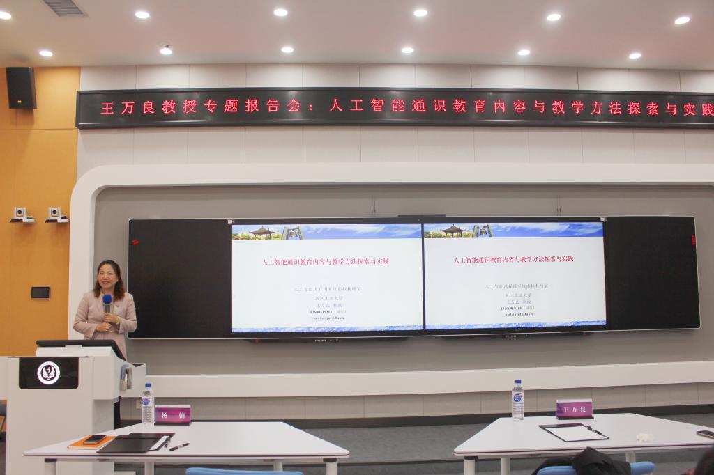 王万良教授在报告中,结合国家人工智能发展战略和教育部关于教育数字化转型的相关部署,深入浅出地阐释了人工智能通识教育的理念、内容、方法及资源建设等,强调人工智能通识教育应注重培养学生的计算思维和问题解决能力,并分享了将课程思政融入专业教学的经验和做法。