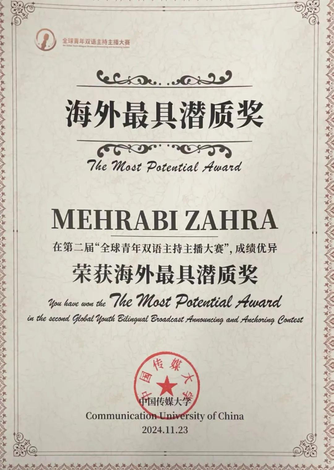本届大赛以“我的中国故事”为主题,围绕亲情、友情、爱情,结合经济、文化、艺术、美食、旅游、运动和健康等多个领域,与当下的热点话题相结合,旨在发掘和培养全球优秀的双语主持、主播人才,以双语主播为桥梁和使者,增进了解与互信,促进世界各国文明互鉴和文化交流。大赛汇聚了来自全球26个国家和地区的500余名选手参赛,经过初评、复评、终评等多轮评审环节,96位参赛选手脱颖而出,荣获各类奖项,梅赫拉比·扎哈拉荣获海外最佳潜质奖。