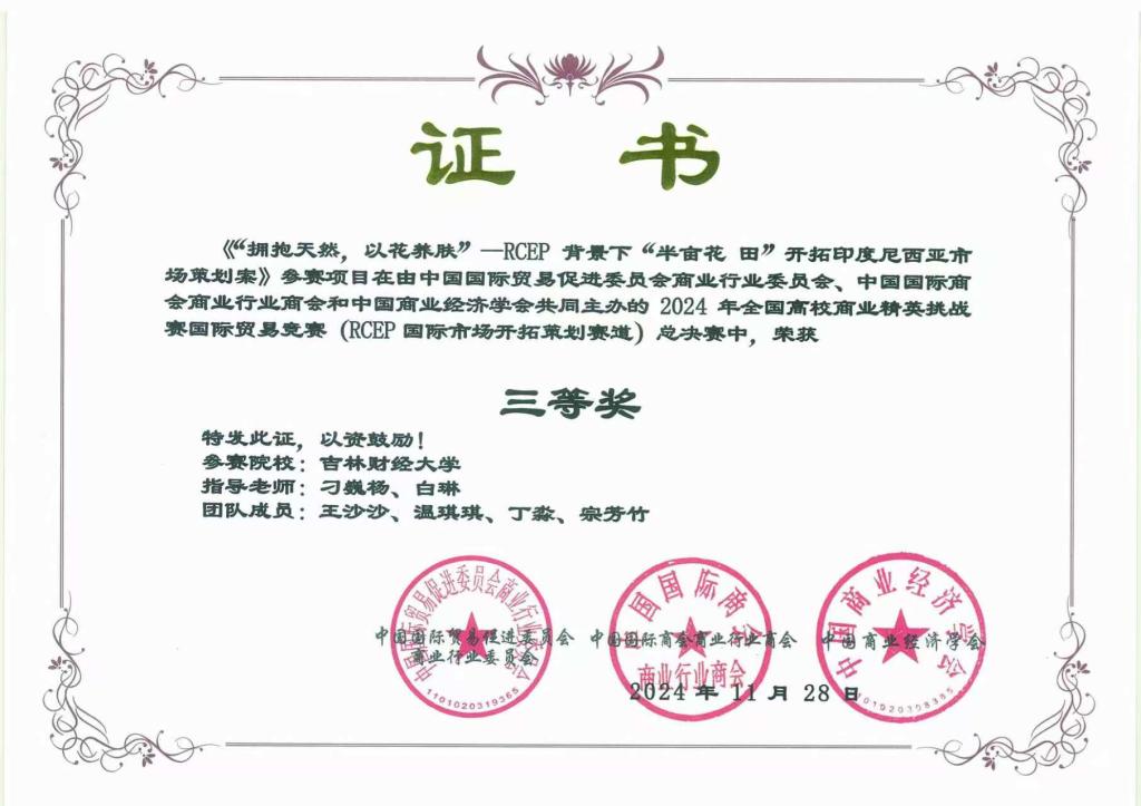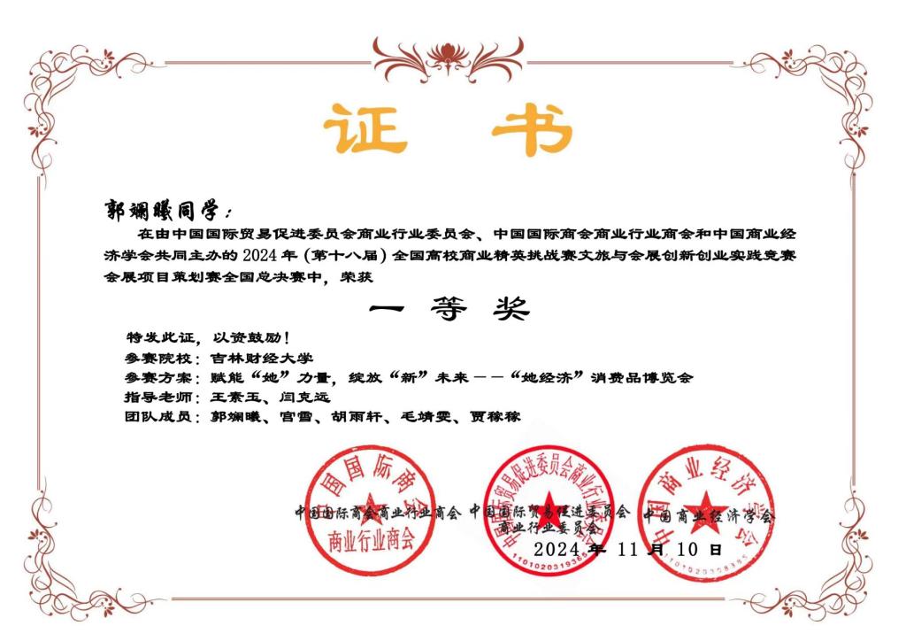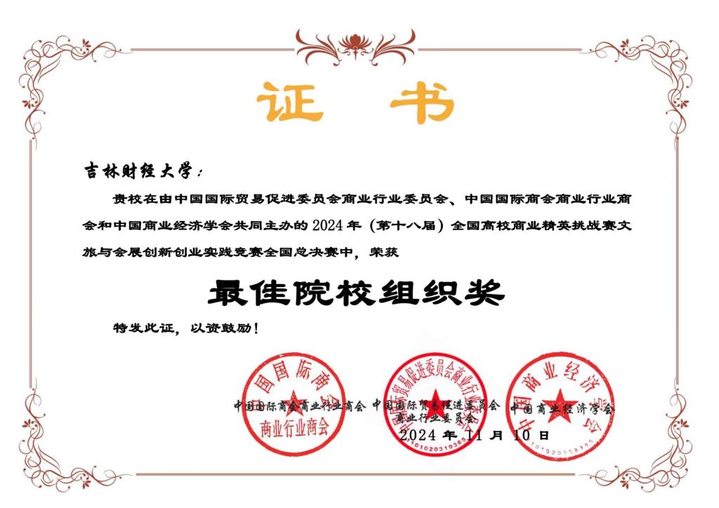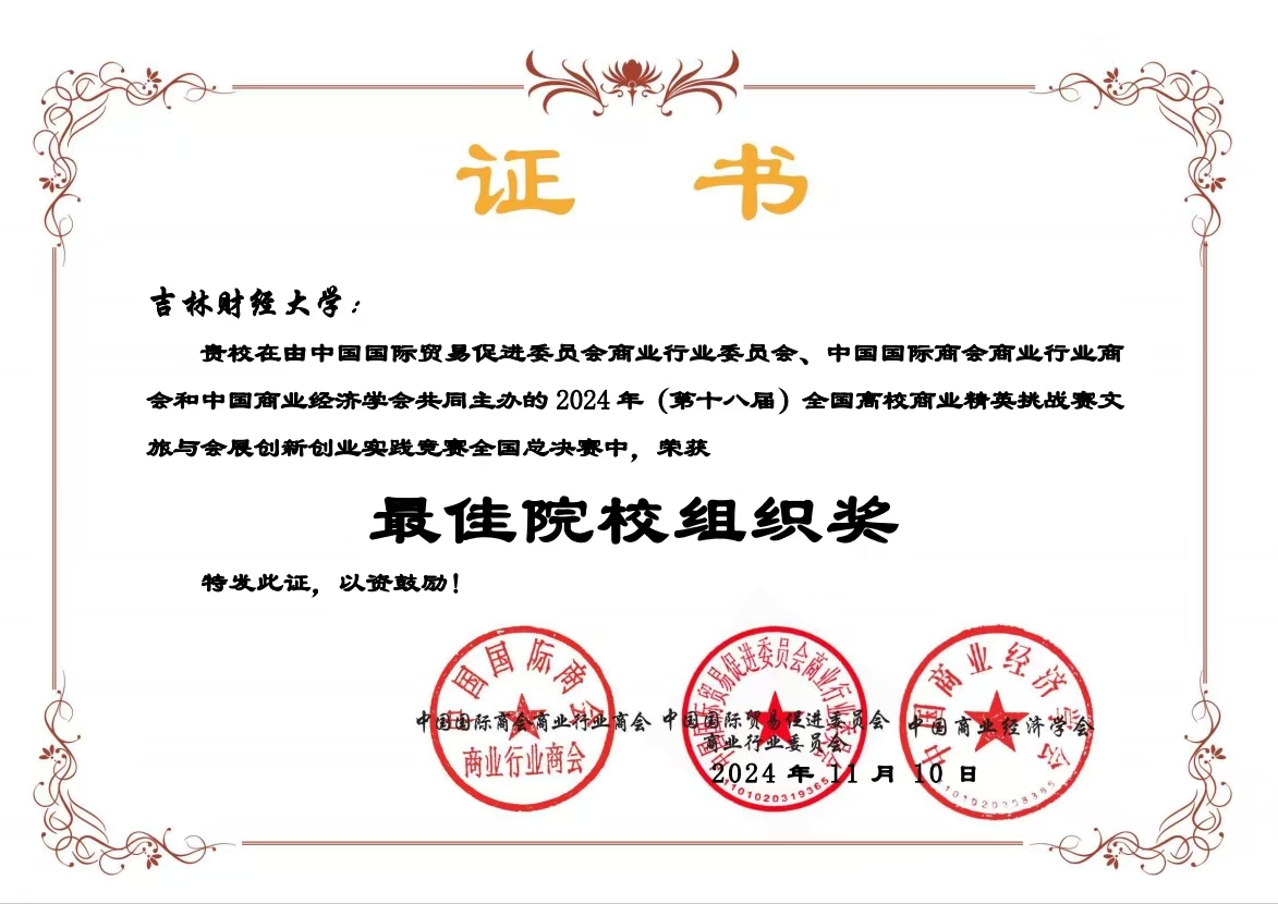 本网讯(国际经济贸易学院 供稿)近日,2024年全国高校商业精英挑战赛全国总决赛落下帷幕,Beat365被竞赛组委会授予“最佳院校组织奖”;学校师生摘得此项大赛国家级奖项24项,其中文旅与会展创新创业实践竞赛一等奖3项、二等奖6项、三等奖2项;国际贸易竞赛二等奖9项、三等奖4项。