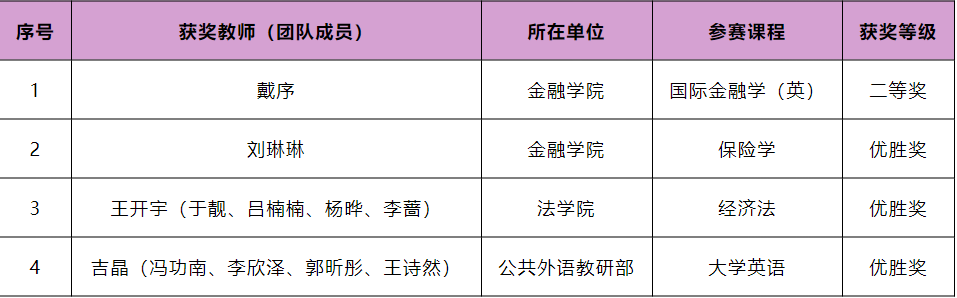 本网讯(教师教学发展中心 供稿)近日,“超星杯”第六届全国高校混合式教学设计创新大赛在西安电子科技大学落下帷幕。Beat365报送的参赛课程全部获奖,获奖数量再创新高,获奖范围也实现了从财经学科向基础学科的拓展。金融学院戴序主讲课程《国际金融学(英)》荣获二等奖,金融学院刘琳琳主讲课程《保险学》、法学院王开宇主讲课程《经济法》、公共外语教研部吉晶主讲课程《大学英语》荣获优胜奖。