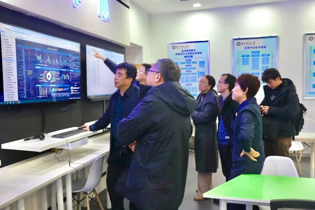 会后,覃红一行在学校教学监测中心观摩了五育平台、教学监测、数据治理平台的现场演示,并参观了WPS云协同、AI行业适配等实训场所。