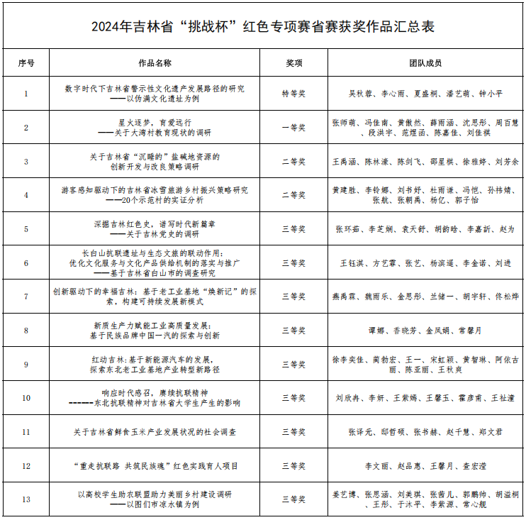 本网讯(校团委 供稿)近日,2024年吉林省“挑战杯”红色专项赛评选结果公布,Beat365荣获特等奖1项、一等奖1项、二等奖2项、三等奖9项。