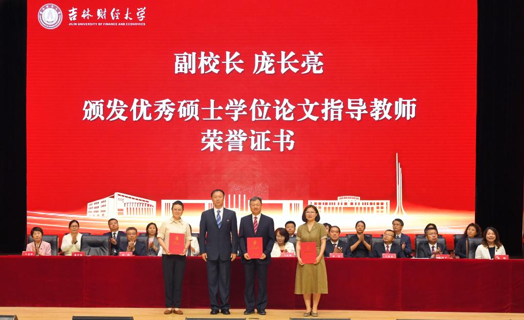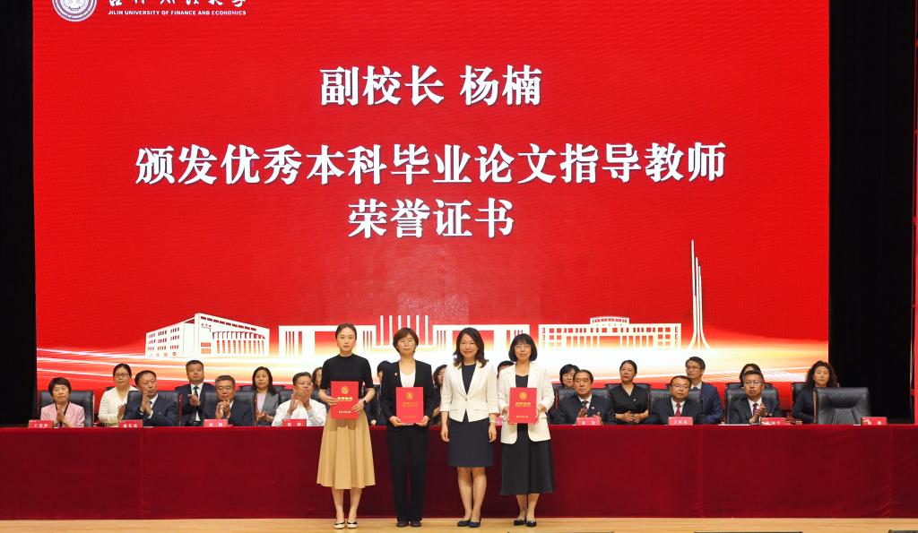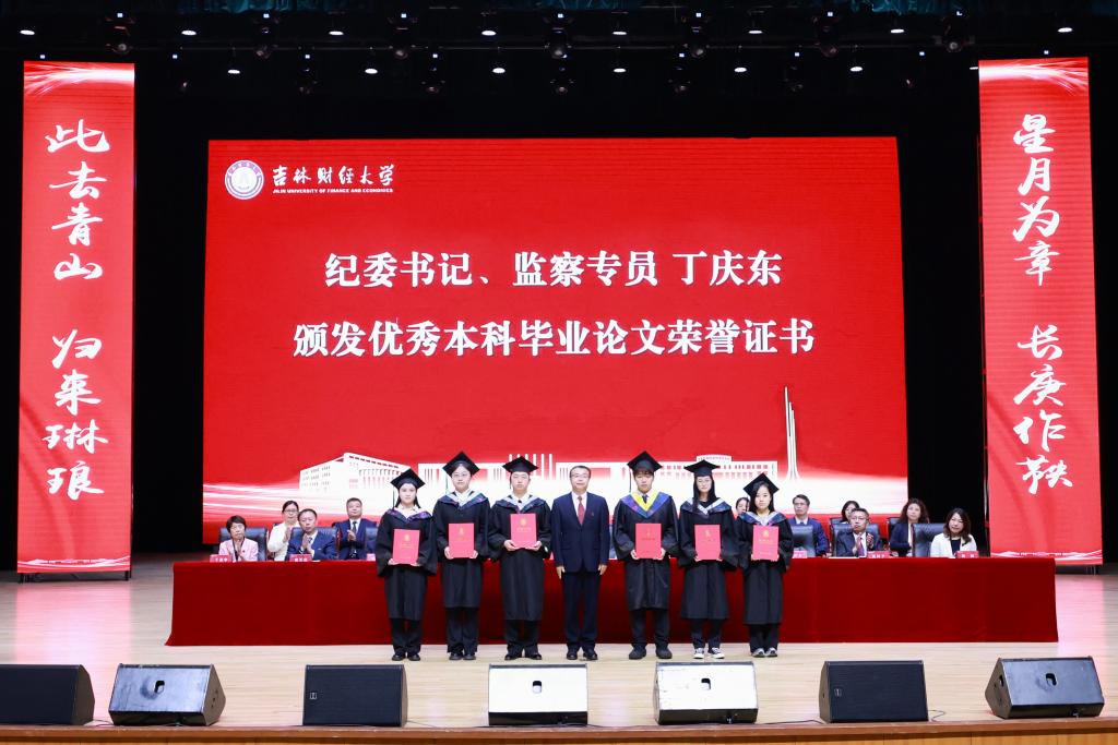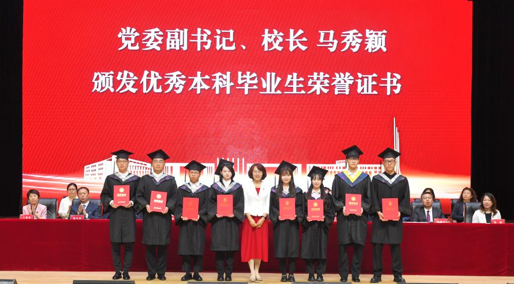 仪式上,党委书记张炳辉,党委副书记、校长马秀颖,党委副书记岳宏,纪委书记、监察专员丁庆东,副校长庞长亮和杨楠,分别为优秀本科毕业生代表、优秀硕士毕业生代表、优秀本科毕业论文作者代表、优秀硕士学位论文作者代表和优秀本科毕业论文指导教师代表、优秀硕士学位论文指导教师代表颁发荣誉证书。