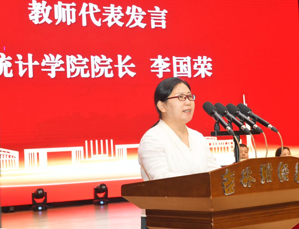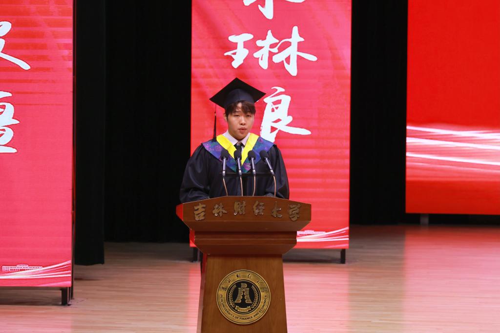 教师代表、统计学院李国荣教授表示在东北振兴战略20周年的新起点上,同学们要紧扣吉林现代化经济体系建设,扎根家乡服务发展,在推动全面振兴中实现人生价值。同时以五个“成长锦囊”寄语毕业生:一具有终身学习的能力,二培养跨界融合的视野,三拥有创新求变的勇气,四立足脚踏实地的作风,五胸怀家国情怀的担当!