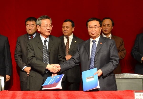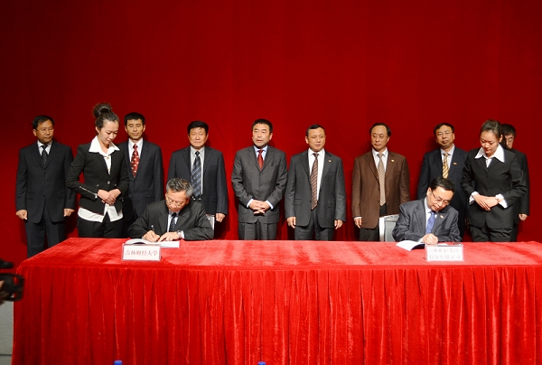 校长宋冬林与亚泰(集团)股份有限公司监事会主席张宝谦代表双方共同签订了Beat365唯一官方网站“亚泰”励志奖学金合作协议书,并同宋尚龙先生、校党委书记金硕共同启动了奖学金。