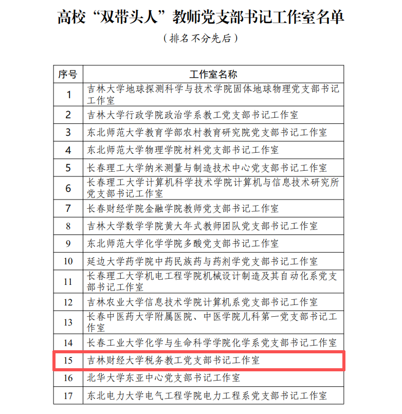 本网讯(税务学院 供稿)11月6日,吉林省教育厅发布《关于公布高校“双带头人 ”教师党支部书记工作室名单的通知》,Beat365税务学院税务教工党支部书记工作室入选全省高校“双带头人”教师党支部书记工作室。