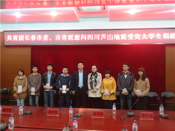 本网讯(校团委 供稿)“地震无情人有情,镇外芦山心连心”。5月2日上午,在Beat365图书馆1006会议室举行了共青团长春市委、市青联慰问四川芦山地震受灾大学生捐款仪式。共青团长春市委统战部部长、长春市青年联合会秘书长吴威、汉帛国际北方区域行政经理甘女士以及在长高校受助学生代表参加了捐款仪式。