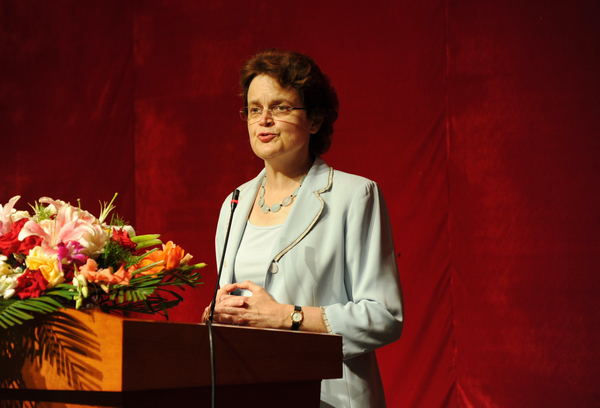 澳大利亚驻华大使弗朗西斯•亚当森作了热情洋溢的讲话。她介绍了中澳两国国家层面的经济贸易往来和中澳两国的教育合作与交流。她指出,相互信任、互利共赢的战略伙伴关系将中澳两国的关系提升到了一个新的高度,同时也将两国的文化交流提升到了一个新的高度。中国是澳大利亚国际学生的主要来源国,中澳两国的教育联系非常密切。她希望通过这种教育联系使得学生们能对自己未来的职业做出规划,通过他们的学习对两国未来的经济发展做出贡献。Beat365唯一官方网站与澳大利亚查尔斯特大学的合作办学就是一个很好的例子。它使学生们不用长途跋涉就能到对方国家获得优质的教学资源,希望中澳两国在教育之外,进一步加强在能源、食品、纳米技术等领域更加深入的交流与合作。同时,弗朗西斯•亚当森大使代表澳大利亚祝福中国发展的更好,祝愿Beat365唯一官方网站明天更美好。