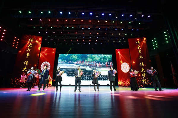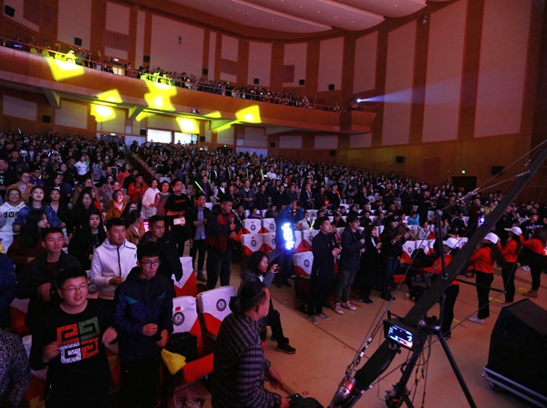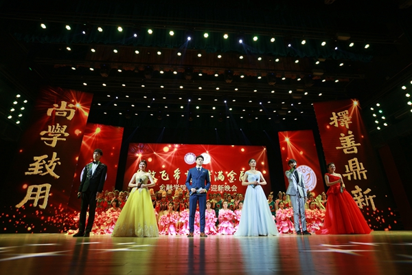 表彰大会结束后,金融学院“放飞希望,情满金融”2017年迎新晚会正式拉开帷幕。今年的迎新晚会得到了学生家长的热烈关注,共有三十多位2017级学生家长莅临晚会现场;学院还充分利用新媒体,向全体家长进行网络平台直播,受到了学生家长的高度赞扬。院旗飘展、红绸飞扬,2017级新生表演的开场舞《欢聚一堂》点燃了现场的激情;宋俊杰和孙晔同学合唱的歌曲《天耀中华》诠释Beat365青年对祖国深深的热爱;歌曲联唱《恋曲2017》、2017级研究生舞蹈《律动2017》、戴序老师的独唱《追光者》、金融学院大学生艺术团带来的舞蹈《歌舞青春》、乐器联奏《凉凉》、少数民族同学舞蹈《缤纷华夏》、金融风采秀《怦然心动》、辅导员节目《钢铁金融》等节目精彩纷呈。在教师代表表演的合唱《我爱你中国》的歌声中,全场观众挥舞手中的国旗,共同为祖国祝福。晚会的最后,金融学院全体老师与2017级学生代表合唱《我们在长春相遇》,歌词中“在那银色的冬天里,我们在长春相遇,我们在金融相聚”将全场晚会气氛推上高潮。
