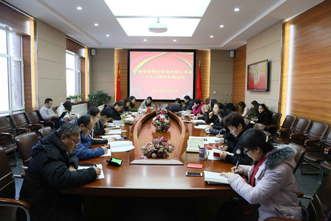 王丽敏院长带领全院党员深入学习十九大报告中关于高等教育的论述,从新时代、新变化、新作为三个角度,结合学院学科建设、办学水平提升、存在的问题等诸多方面展开论述,深入浅出带领全院党员学习十九大精神,党员们纷纷表示,在今后工作中,以十九大精神为指引更好的完成学院各项工作。