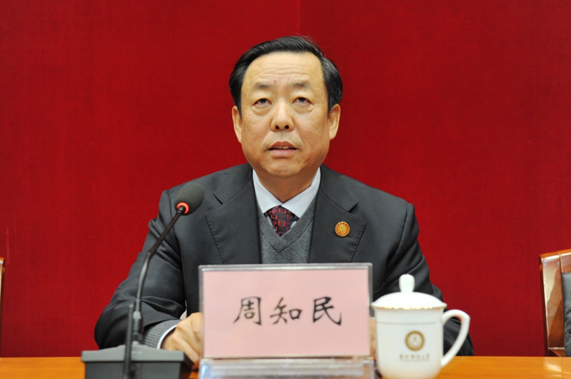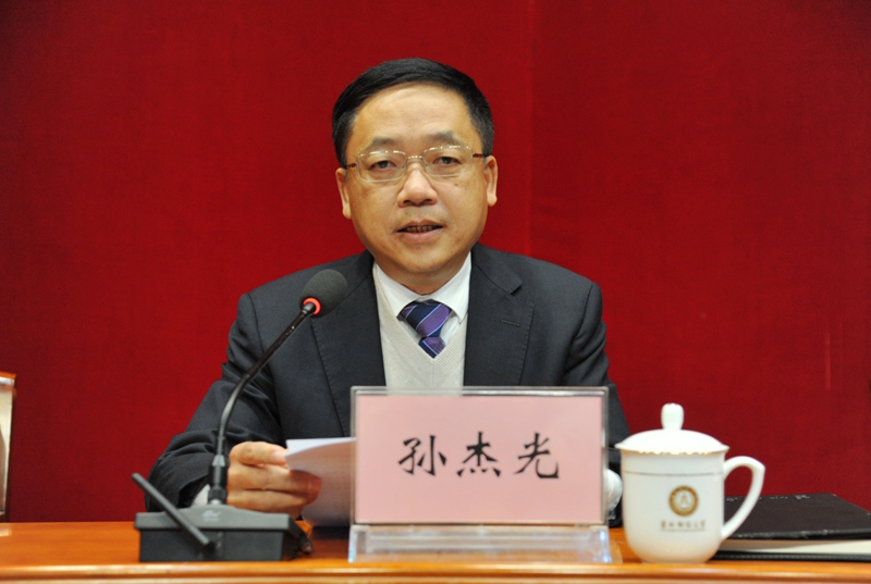周知民主持会议并讲话。他代表学校领导班子及全体教职员工对孙杰光校长的到来表示热烈的欢迎!他表示,学校将坚决服从省委决定,切实把思想统一到省委决定上来,积极配合、全力支持孙杰光校长的工作,保证学校各项工作顺利衔接和平稳过渡。学校将以习近平新时代中国特色社会主义思想为指导,认真贯彻落实党的十九大精神和全国教育大会精神,贯彻落实党委领导下的校长负责制,在省委省政府、省委教育工委的正确领导下,努力建设善于办学理校的领导班子,进一步增强学校领导班子和全体师生员工的凝聚力、战斗力和创造力,带领全校教职员工承前启后、继往开来,切实增强发展高等教育事业的责任感和使命感,以办好人民满意的教育为宗旨,继续秉承“明德崇实”的校训精神,坚持立德树人,坚持走内涵式发展道路,力争抓住学校发展的机遇,顺势而上,不断深化改革,提高办学质量,突出办学特色,提升综合实力,推动学校各项事业在新的起点上取得新成就,再上新台阶,为建设高水平财经大学作出新的更大的贡献!