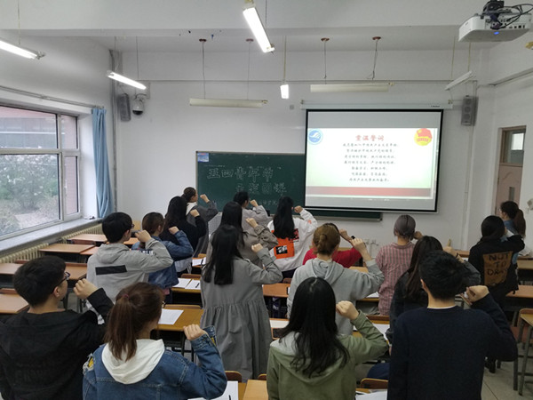 会议过程中,全体出席人员一起深入了解共青团历史、共同重温入团誓词、详细介绍并认真学习五四精神。随后,团委成员为大家细致讲述了习近平在关于北京大学师生座谈会上的讲话内容,并从自己的学习和生活等方面深入理解了习近平总书记重要讲话精神,反思了自身存在的问题和差距,同时对习近平总书记的讲话内容产生了深刻的体会和感悟。在同学们的感悟和交流过后,四位学生代表的发言更着重突出了当代共青团员的先进性和荣誉感,积极响应习近平总书记对新时代中国青年新的要求和殷殷期望。最后,全体出席人员高声合唱共青团团歌,伴随着嘹亮的歌声,本次团课也落下帷幕。
