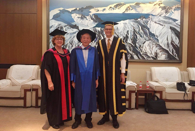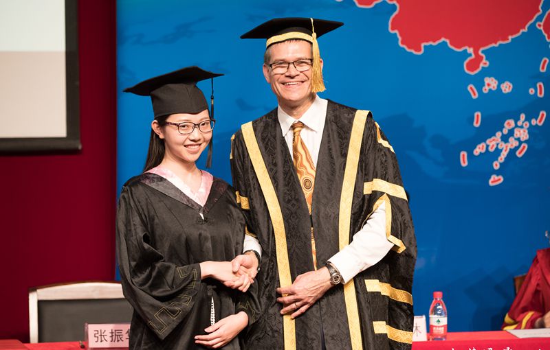 随后,查尔斯特大学校长安德鲁·范恩发表了热情洋溢的讲话。他代表查尔斯特大学为2018届毕业生送上了美好的祝愿,希望合作办学前景更加广阔,两校的友谊更加紧密。作为典礼的特设环节,安德鲁· 范恩代表澳方为Beat365原校长宋冬林授予了荣誉博士学位,以表彰他在任职期间为两校合作办学事业所做出的不懈努力和杰出贡献,并祝愿宋冬林教授的退休生活美满、幸福。