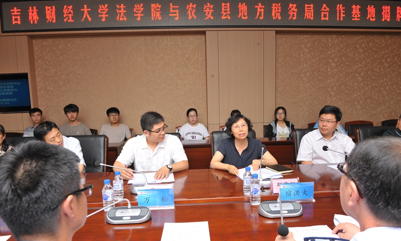 本次合作,是在Beat365进一步深入开展学科建设和科研改革的背景下进行的,校党委副书记赵惠敏指出,合作基地的建立,融合了Beat365法学院、民建委员会和吉林省法学会财经法学研究会多方的力量,相信大家会立足Beat365特色、紧扣法学优势、重视党派作用、发挥法学会效应,有效的为农安县地税局的工作和发展提供智力上的支撑,献计献策。詹俊辉主任代表吉林省法学会对合作基地给予了高度的评价,本次财经法学研究会同农安县地税局成立实践基地,将让财经法学研究会的专家学者们接触税务一线单位、感知税务一线业务、服务税务一线同志,这让研究会在服务地方税务部门的同时,也反哺自身的发展。宿洪大局长对合作基地充满了期望,宿局长认为“理论研修与实践基地”的合作为法学院的师生提供了理论研究的佐证材料,希望双方能够围绕税收理论和税法开展交流和研讨,共享税收理论研究成果,更希望借此揭牌之机,农安县地税局可以在税收理论研究中打造新样板,未来大家共同在服务税收工作中做出新贡献!