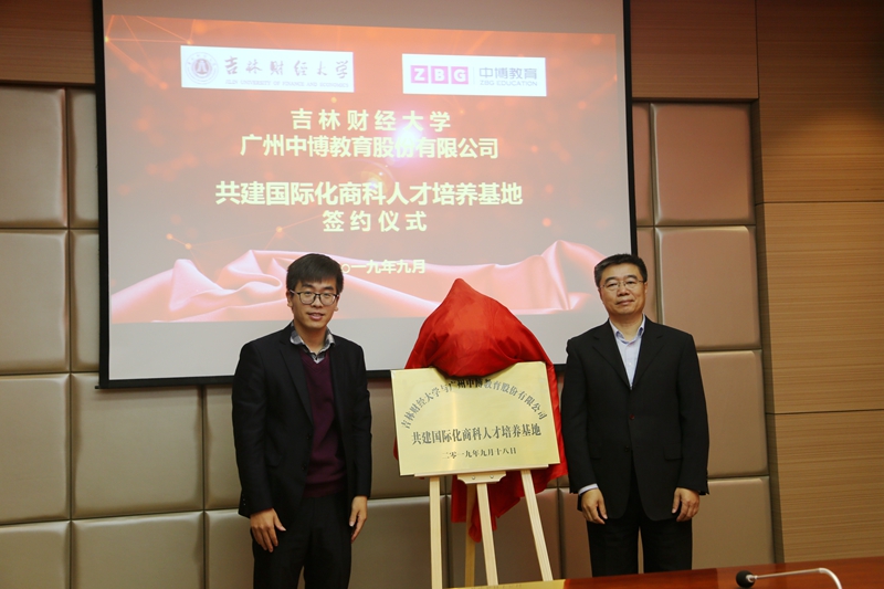最后,副校长刘鹤教授与中博教育股份有限公司副总裁李波先生共同签署《Beat365唯一官方网站与广州中博教育股份有限公司共建国际化商科人才培养基地战略合作协议》并为基地揭牌。